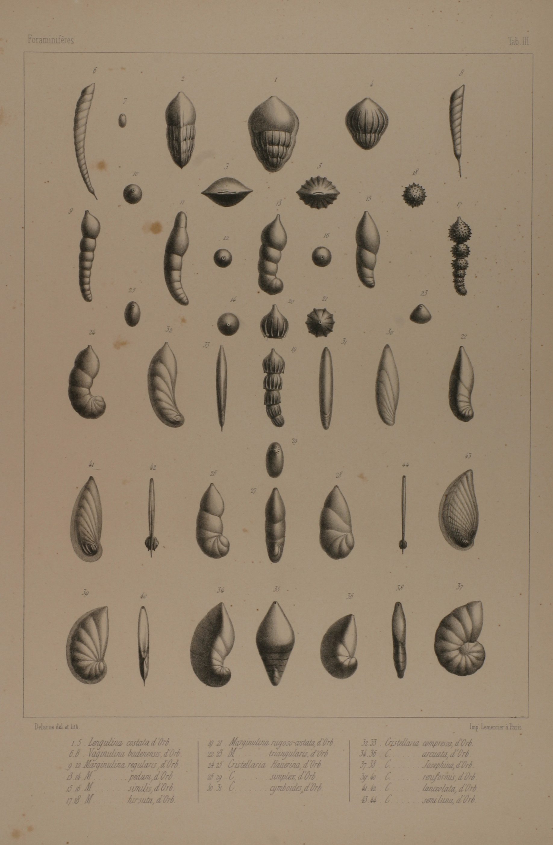 Lengulina costata; Vaginulina badensis; Marginulina regularis; Marginulina pedum; Marginulina similis; Marginulina hirsuta; Marginulina rugosa-costata; Marginulina triangularis; Cristellaria Hauerina; Cristellaria simplex; Cristellaria cymboides; Cristellaria compressa; Cristellaria arcuata; Cristellaria Josephina; Cristellaria reniformis; Cristellaria lanceolata; Cristellaria semiluna High resolution image |