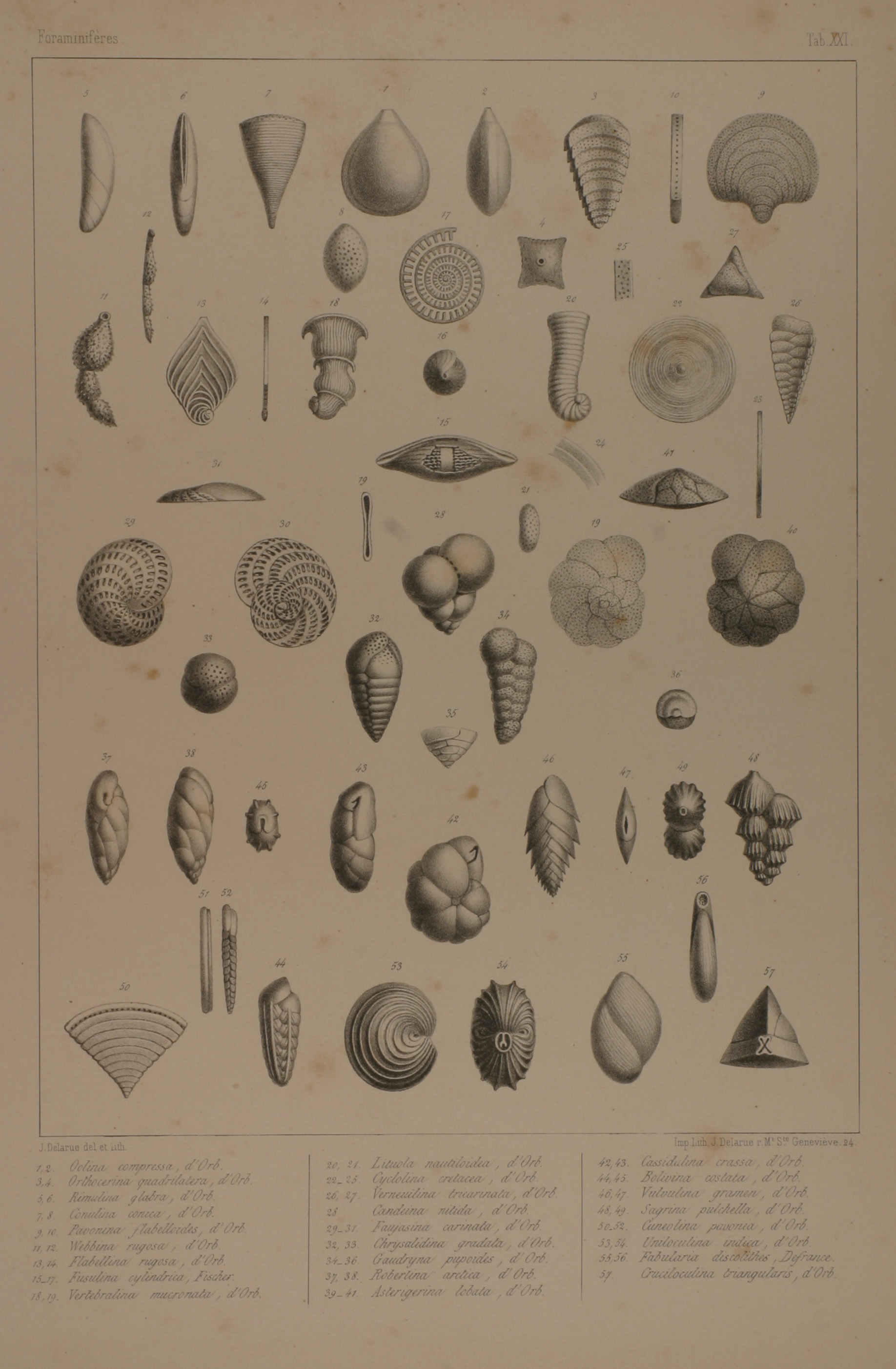 Oolina compressa; Orthocerina quadrilatera; Rimulina glabra; Conulina conica; Pavonina flabelloides; Webbina rugosa; Flabellina rugosa; Fusulina cylindrica; Vertebralina mucronata; Lituola nautiloidea; Cyclolina cretacea; Verneuilina tricarinata; Candeina nitida; Faujasina carinata; Chrysalidina gradata; Gaudryna pupoides; Robertina arctica; Asterigerina lobata; Cassidulina crassa; Bolivina costata; Vulvulina gramen; Sagrina pulchella; Cuneolina pavonia; Uniloculina undica; Fabularia discolithes; Cruciloculina triangularis High resolution image |