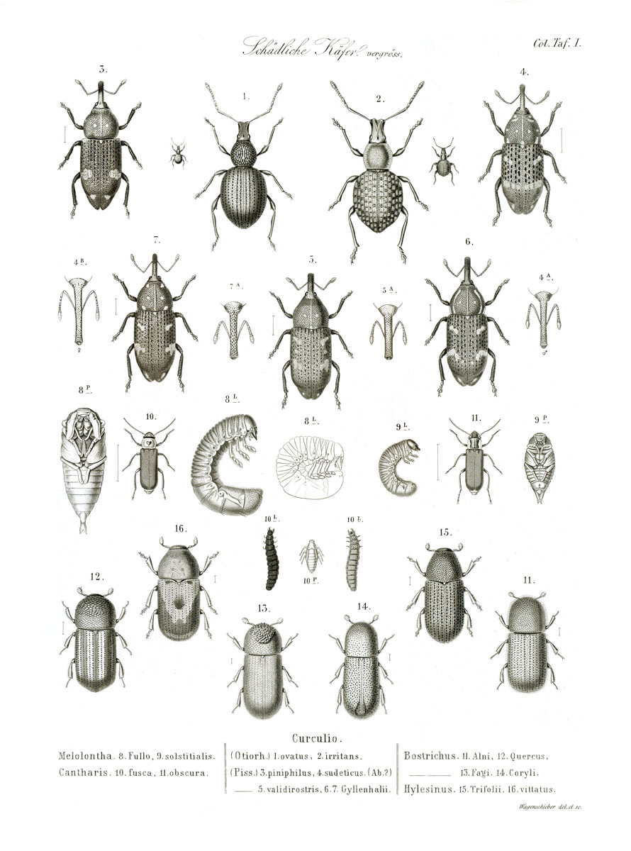 Melolontha fullo; Melolontha solstitialis; Cantharis fusca; Cantharis obscura; Curculio ovatus; Curculio irritans; Curculio piniphilus; Curculio sudeticus; Curculio validirostris; Curculio gyllenhalii; Bostrichus alni; Bostrichus quercus; Bostrichus fagi; Bostrichus coryli; Hylesinus trifolii; Hylesinus vittatus
