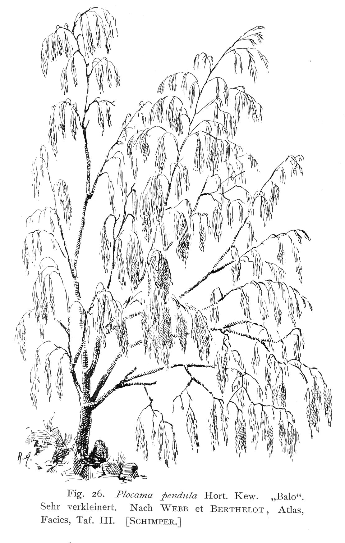"Zu den häufigsten und charakteristischsten Gewächsen der tieferen Landschaften von Teneriffa gehört ein 6-12 Fuß hohes Bäumchen, der "Balo", Plocama pendula Hort. KEW., welche zu den Rubiaceen der Anthospermen gehört, die auf den Canaren durch eine zweite Gattung, Phyllis, außerdem aber nur noch in Südafrika und Australien, dort aber reichlich, vertreten ist. Die sehr dünnen, aber zähen und elastischen Aeste des Balo hängen schlaff herab; sie tragen schmale Blätter und bedecken sich im Frühjahr mit kleinen weißen Blüten, aus welchen weiße Beeren sich entwickeln (Textfig. 26 und 27).