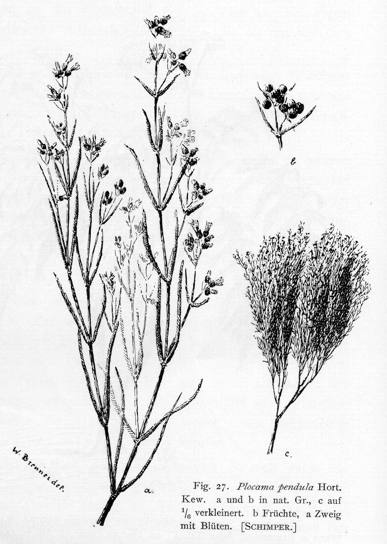 Full size, 300 dpi Screen size Plocama pendula Hort. Kew. a und b in nat. Gr., c auf 1/6 verkleinert. b Früchte, a Zweig mit Blüten. [SCHIMPER.] |