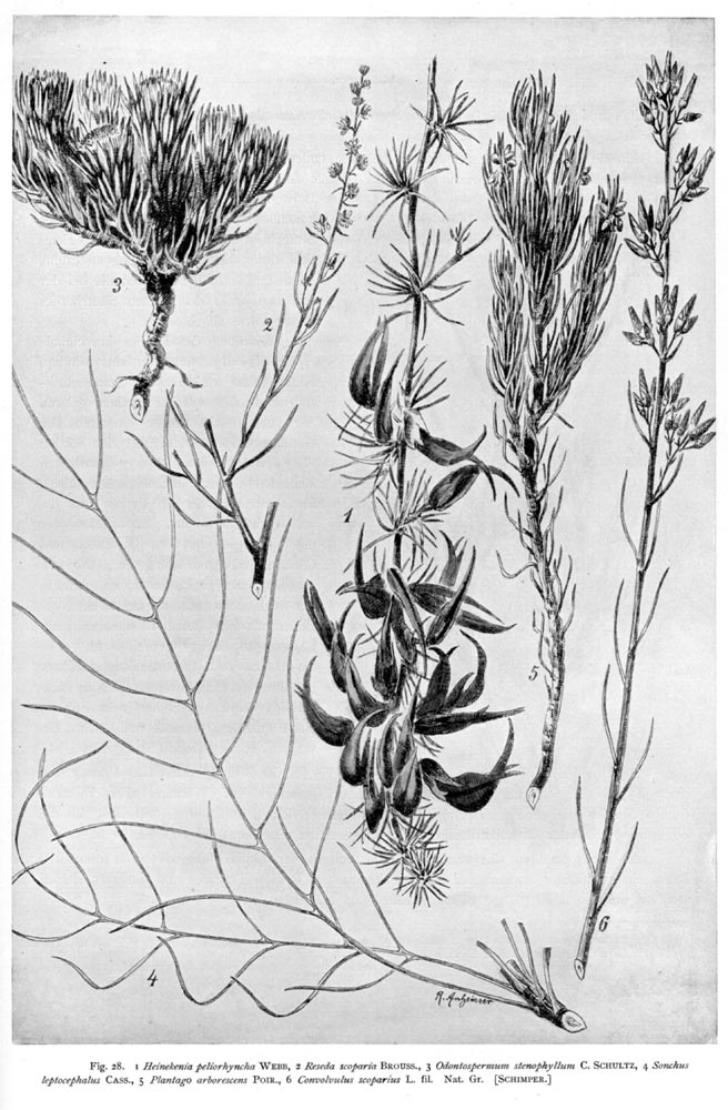Full size, 300 dpi Screen size 1 Heinekenia peliorhyncha WEBB, 2 Reseda scoparia BROUSS., 3 Odontospermum stenophyllum C. SCHULTZ, 4 Sonchus leptocephalus CASS., 5 Plantago arborescens POIR., 6 Convolvulus scoparius L. fil. Nat. Gr. [SCHIMPER.] |