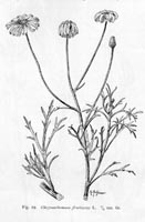 Zerteilung des Laubes in schmale Zipfel als Anpassung an des windige Klima haben wir bereits bei Sonchus arboreus und Leptocephalus kennen gelernt. Sie kehrt auch wieder innerhalb der Gattung Chrysanthemum bei der Sektion Argyranthemum. Die 7 canarischen Endemen dieser Sektion stellen kleine Sträucher vor; als ihr Typus kann die auf Steinfeldern und an Felsen der unteren Region auf Tenerife, Palma und Canaria verbreitete "Magarza", Chrysanthemum frutescens L., gelten, ein Strauch, der wegen seiner schönen weißen Strahlenblüten als Zierpflanze in unseren Kalthäusern allgemein verbreitet ist. Die ein- bis zweifach fiederschnittigen Blätter mit ihren linealen, etwas succulenten, blaubereiften Zipfeln, verleihen dem Strauch einen graziösen Habitus und leichte Beweglichkeit im Winde (Textfig. 29).